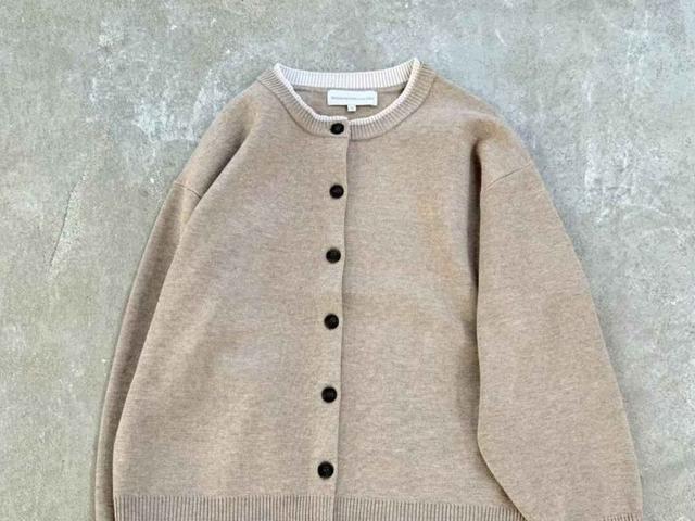 重ね着は苦手だけどコーデは手抜きに見せたくない、そんな大人世代におすすめしたいのがこちら。首元と袖口の配色部分がレイヤード風になっていて、1枚でサマ見えが狙えるクルーネックカーディガン。「しっかりとした肉感が特徴のミラノリブ編み」(公式Instagramより)は、きちんと感も出やすく、ラフに傾きすぎないのも魅力の一つです。