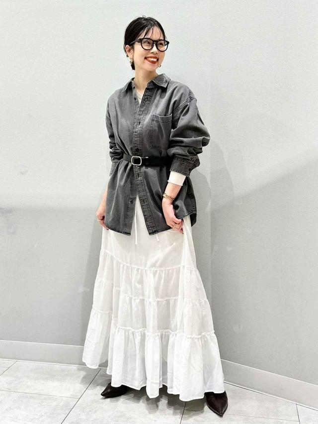 クールで落ち着いた雰囲気が漂うグレーのデニムシャツ。地味見えを回避したいときは、華やかなティアードスカートとのスタイリングがおすすめ。甘めのティアードデザインも、デニムシャツと合わせれば程よくカジュアルに落とし込めます。オーバーサイズのシャツはだらしなく見えないように、ベルトで引き締めるのが◎ 足元はシックな黒のシューズで、甘辛ミックスに仕上げた春コーデです。