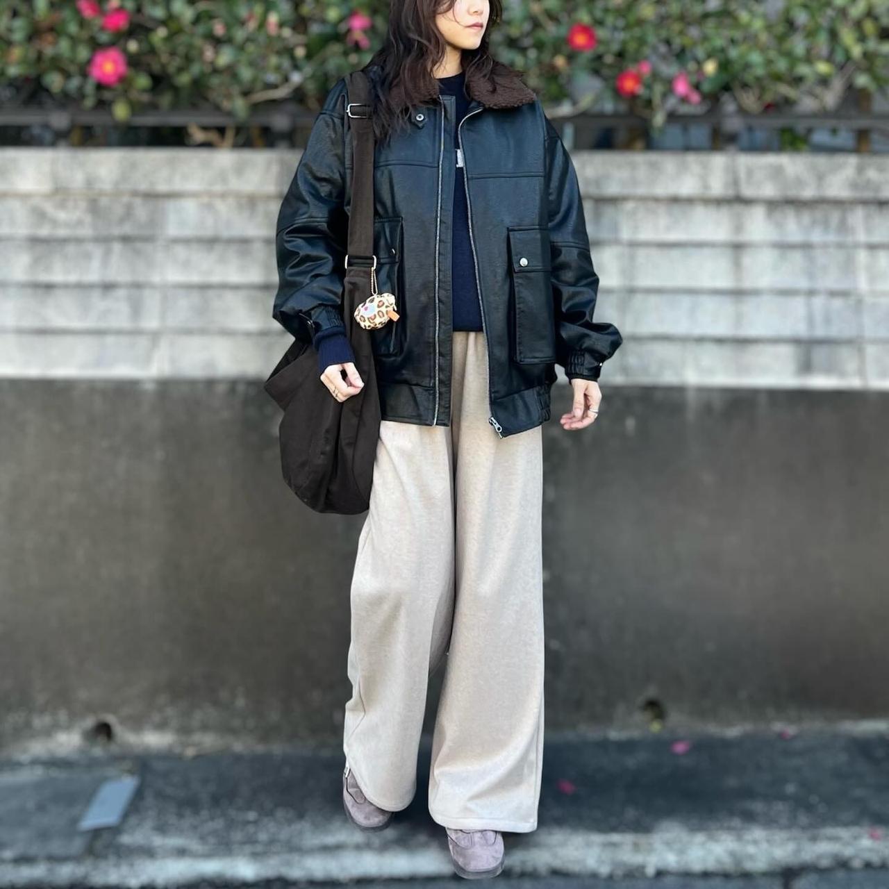フレアシルエットで、脚長効果にも期待できるパンツ。ゆったりしすぎずラフ見えしにくいので、大人も取り入れやすそうです。@uuut3671さんは「色味もシルエットも最高すぎ」と絶賛。淡色のパンツを引き締める、黒のレザー調ブルゾンを合わせて辛口に仕上げています。