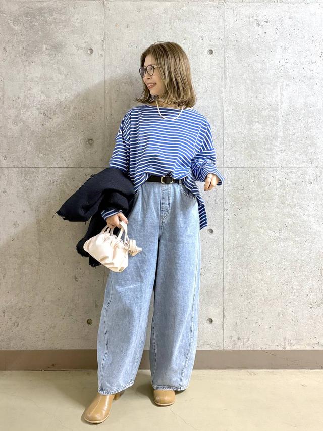 濃淡異なるブルー合わせた、爽やかな同系色コーデ。ボーダーTシャツの濃いブルーと、ジーンズの淡いブルーが自然につながり、カジュアルでも大人らしくまとまっています。バレルジーンズはベルトのプラスワンで、メリハリのある印象に。アイボリーのバッグとベージュブーツが “抜け” を添えています。