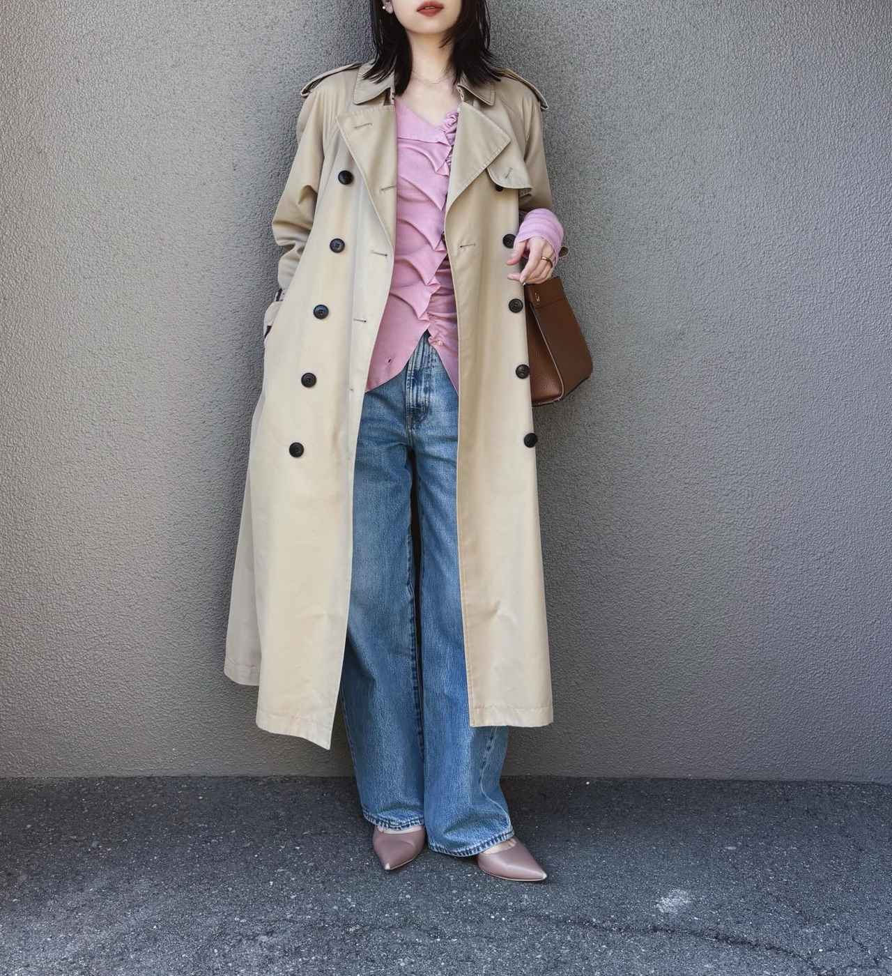ベーシックなトレンチコートのインナーに、ピンクトップスを忍ばせてさりげない甘さをプラス。動くたびにちらりと見える色味が、コーデに華やぎを添えてくれます。ボトムスはジーンズを選んで、程よくカジュアルダウンするのが旬のバランスに仕上げるコツ。甘さとラフさを掛け合わせた、大人の日常にちょうどいい着こなしです。