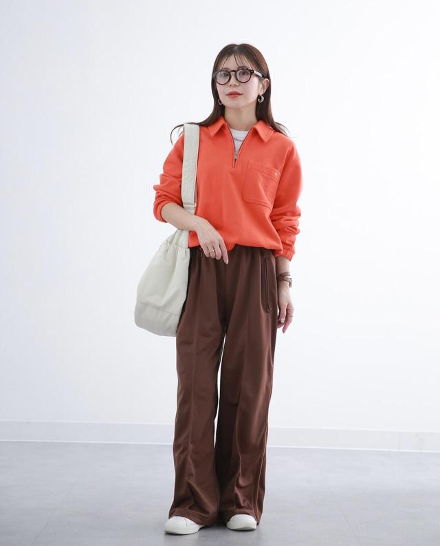 スポーティーな雰囲気を醸し出すトラックパンツ。サイドには配色のパイピングが施されており、爽やかなアクセントに。裾のファスナーを開けるとさりげないシルエットの変化も楽しめます。ストンとした落ち感のある素材なので、カジュアルながらもきれいめに穿けそう。スウェットトップスでラフに着こなしたり、かっちりとしたジャケットで大人顔に仕上げるのもおすすめ。