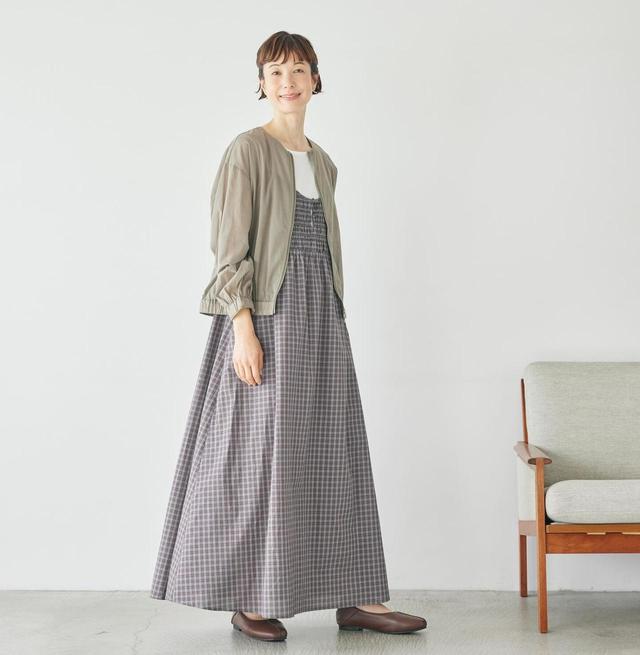春の気温差対策に、サッと羽織れるジャケットがあると便利。ノーカラーデザインで、きれいめにもカジュアルにもマッチしそうです。透け感があり軽やかで、合わせやすいアースカラーもポイント。チェック柄のキャミワンピースは、たっぷりのボリュームが目を引いて高見えする主役級の存在。胸元のシャーリングが、コーデに華やぎを添えてくれます。