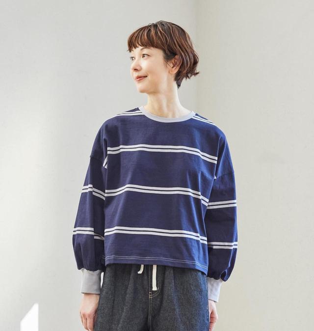 ネイビー × グレーの落ち着いた配色とダブルラインで、定番のボーダー柄トップスにこなれ感をプラス。可愛らしいボリューム袖を太めリブの袖口がキュッと引き締めて、メリハリのある印象をつくります。ほどよくワイドな身幅とドロップショルダーでリラックス感があり、楽ちんに着こなせそうなのも嬉しいポイントです。