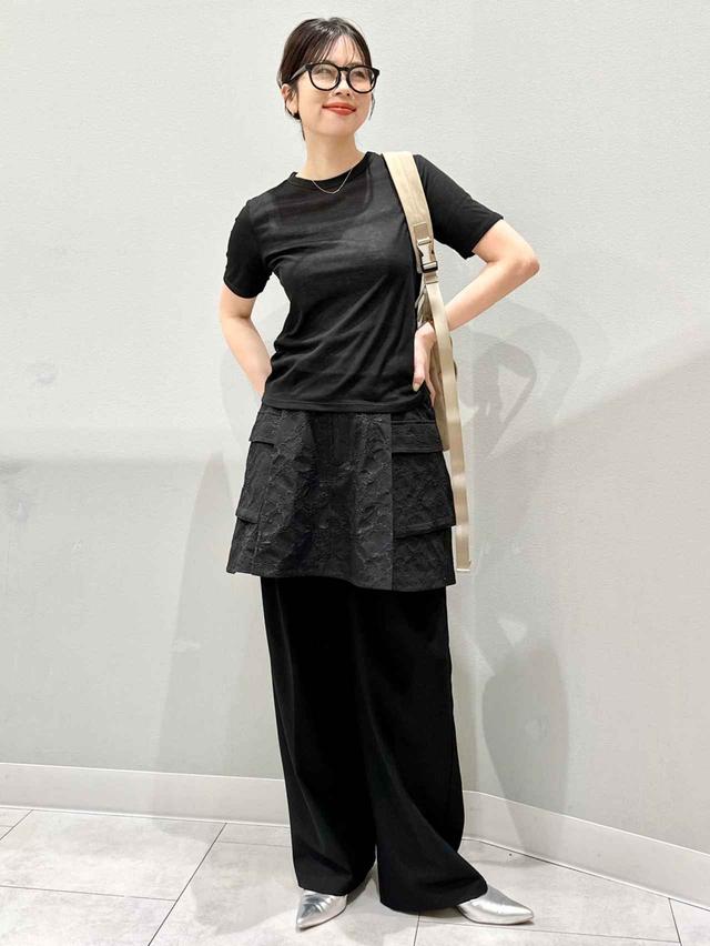 パンツにスコートを重ねるだけで、コーデにメリハリがプラスされています。ワンカラーでまとめても、表情のあるジャカード素材によってのっぺり見えを回避。シンプルなワンツーコーデも、手抜き感のない洗練された着こなしに仕上がります。