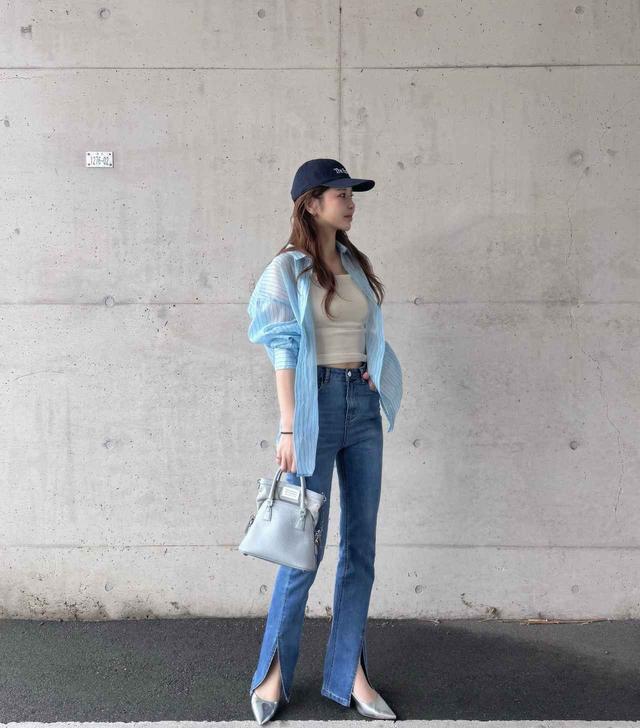シアー素材とストライプ柄の組み合わせが涼しげな、薄手シャツが主役。サックスブルーが、顔まわりをパッと明るく見せてくれそうです。軽やかな質感で、ジーンズコーデにさっと羽織るだけでも季節感のある着こなしが完成。前を開けたり、袖をたくしあげたりして、どこか肩の力を抜いた印象を狙うと◎