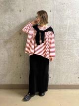 こちらのスタッフさんは、ティアードスカートを合わせて「爽やか大人フェミニン」な着こなしを提案。ピンク × ホワイトの明るく華やかな配色が、シーズンムードを一気に盛り上げます。デコルテを見せたり袖をたくし仕上げたりすることで、こなれ感もアップ。足元はスニーカーでスポーティに決めれば、春のお出かけシーンにもぴったりのコーデが完成です。