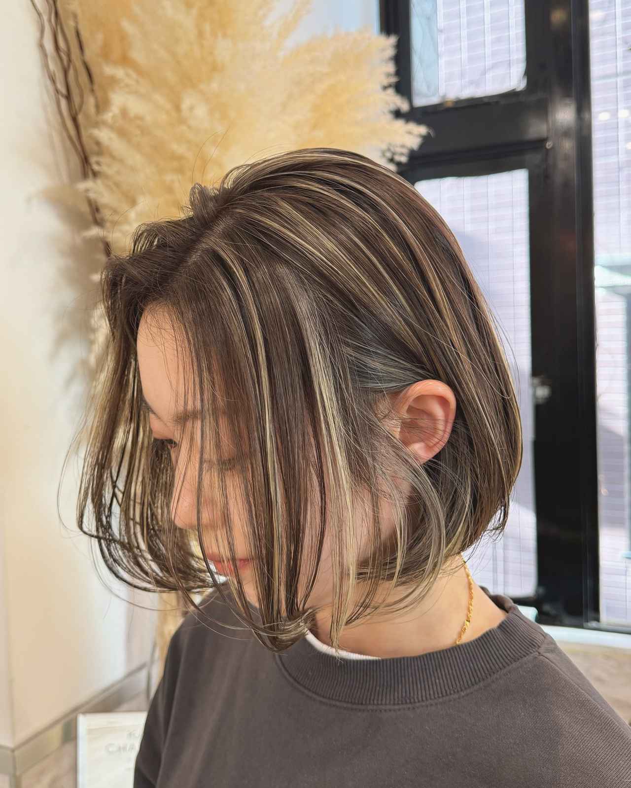すっきり首を出した短めボブに、細すぎず太すぎないハイライトを入れたアレンジ。ハイライトを太くしたり、ベースの髪色とのコントラストを強くすると華やかな印象が楽しめますが、大人っぽくサラッと落ち着いた印象に仕上げたい場合は、やや細めにコントラストも弱めに入れるのがオススメです。画像のように、全体的に散らすことで白髪が目立たず、デザインカラーとしてオシャレを楽しんでいる印象に。