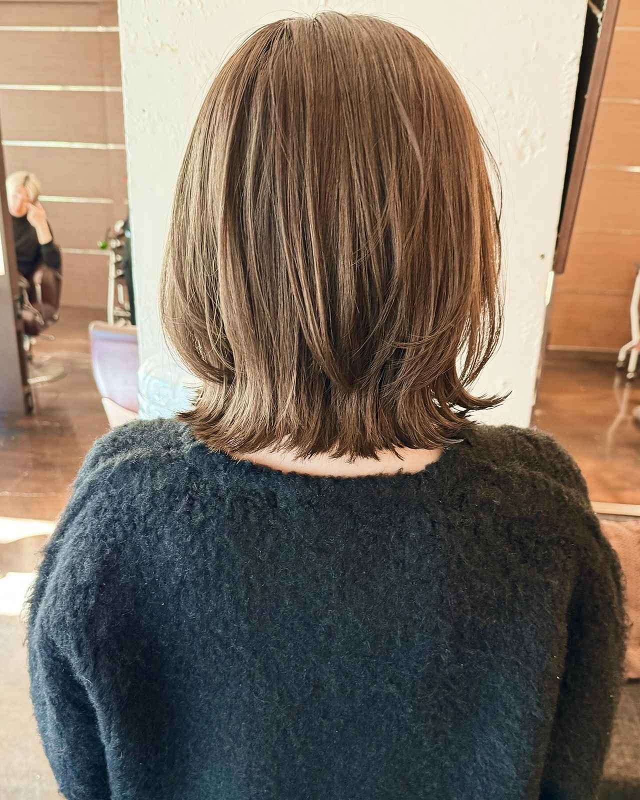 レイヤーボブに明るめのベージュを合わせたプチウルフ。ベースは自然な外ハネで、ぷつっとしたライン感を残さず柔らかに仕上げています。トップはやや長めに残してふわっと内に入れ、レングスの差を活かしたくびれ感を演出。女性らしさを損なわず、動きと立体感が引き立つデザインです。