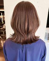 結べるギリギリの長さを残した短めのミディアムレイヤー。ベースは外ハネ、トップはふんわり内に入れることで柔らかなくびれが生まれます。透け感のあるベージュカラーを組み合わせると軽さが一層際立ち、髪の動きがきれいに映える仕上がりに。長さをキープしながらも雰囲気を変えたい人にぴったりです。