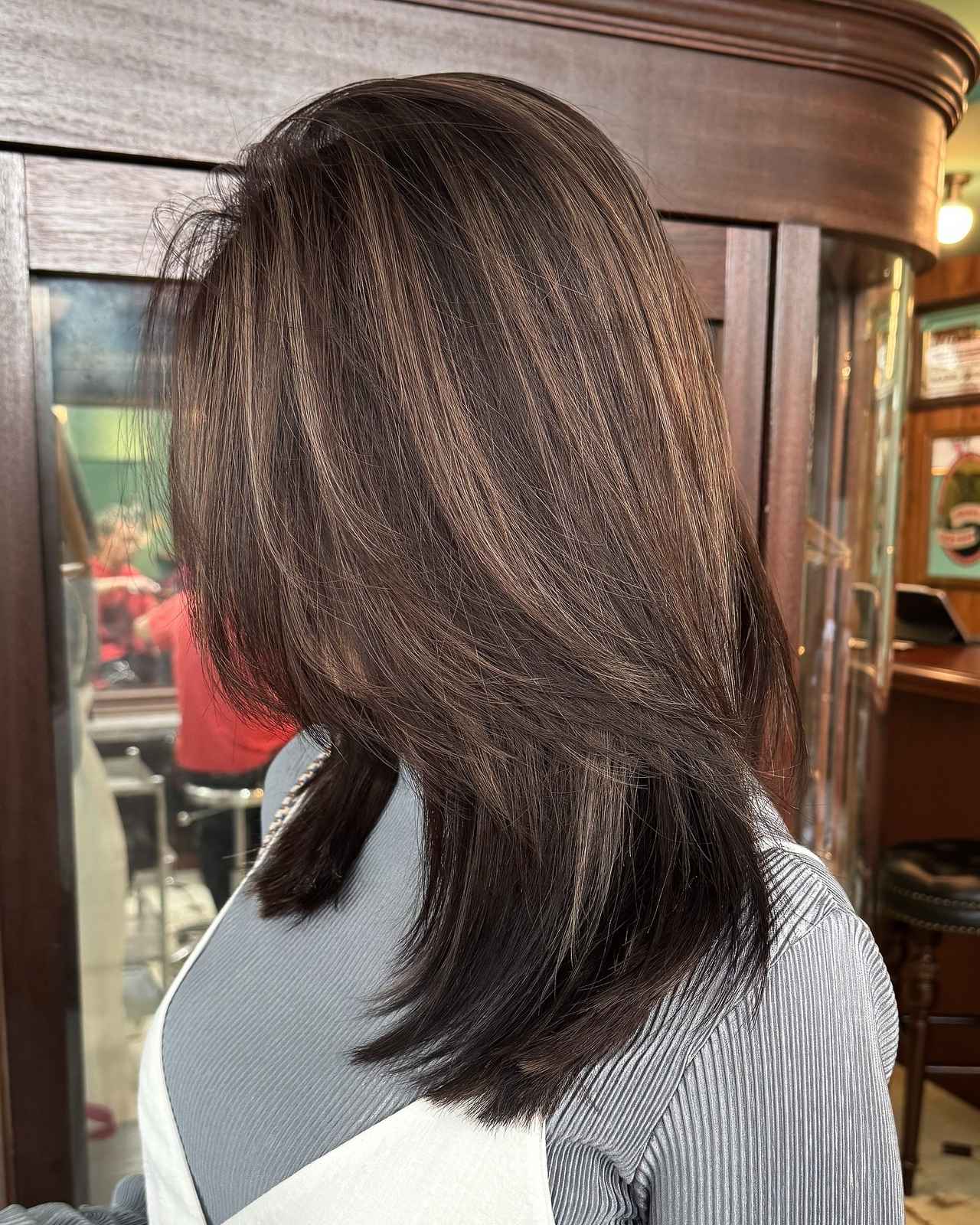 最初にご紹介するのは、重さを残した秋らしいレイヤーミディ。細かなハイライトを全体へ散らすことで、自然に白髪をなじませています。レイヤーの動きと光の効果でボリューム感が増し、立体的なシルエットに。ベースは落ち着いたブラウンカラーながらも華やかさも感じられる、大人にちょうどいい仕上がりです。