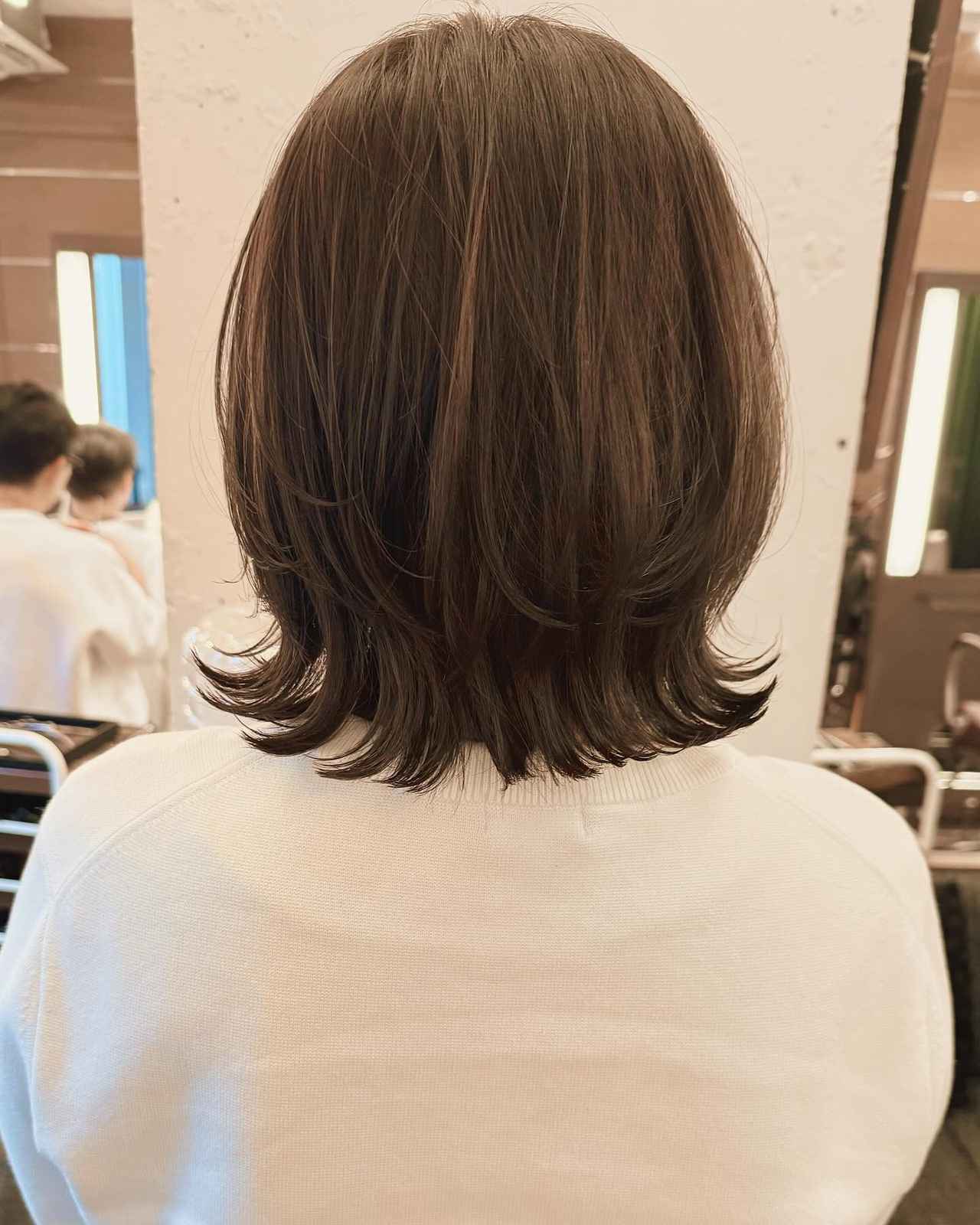 ベースは外ハネに、トップは内に入れたレイヤーロブ。毛流れの方向を分けることで、まとまり感を残しながら軽やかさも演出できます。暖色ブラウンのカラーで髪全体が柔らかく見え、艶感もアップ。季節感のあるカラーと自然な動きが合わさり、落ち着きの中にも華やかさが感じられます。