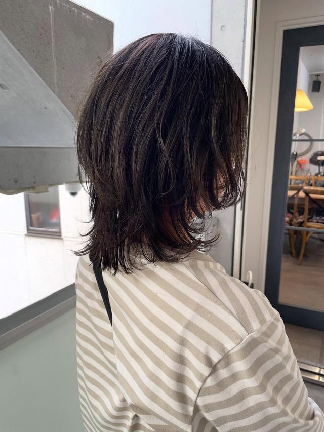 くすみブラウンの透明感が印象的なレイヤーミディ。しっかりと段は入れつつ、トップを長めに残して毛先を内に、ベースは外ハネで自然な動きをつけています。トップとベースの重なりに空気がふわりと入り、まとまりの中に軽さが宿る仕上がりに。程よい抜け感が大人の髪を柔らかく見せます。