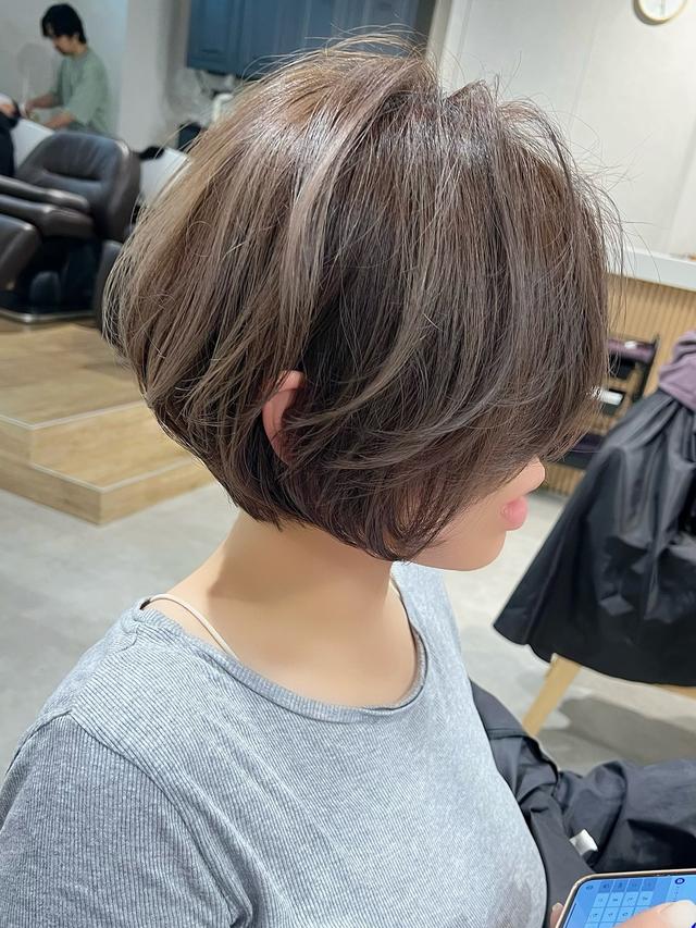 透明感のあるグレージュカラーが上品なショートボブ。後頭部にふんわりと丸みを持たせ、襟足をタイトに絞ることできれいなくびれをつくっています。トップは根元から軽く立ち上げて空気を含ませるように仕上げ、横顔まで美しいシルエットに。やわらかさと立体感のバランスが絶妙です。