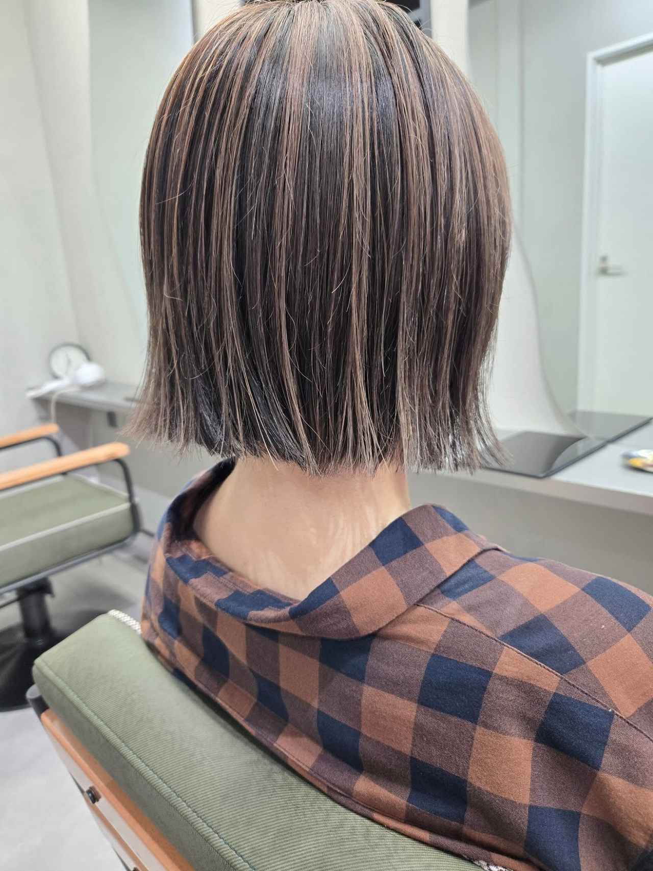 毛先を直線的にカットするだけでも今っぽさが漂うボブですが、さらにカラーリングでひと癖つけて、周りと差をつけてもグッド。髪の表面だけをブリーチして、透明感のあるベージュ系カラーを施すことで程よい個性を演出できそう。カットだけでなく、カラーリングでも遊びを加えて、自分らしいオシャレを楽しんでみて。