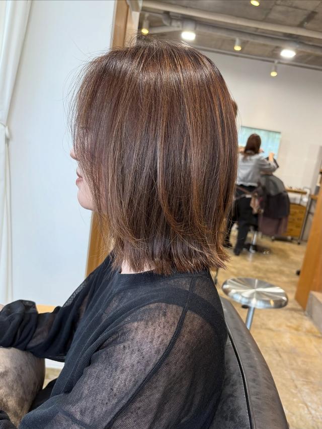 つるんとした艶感が印象的なストレートボブ。明るめブラウンに、ほんのり黄みを感じるベージュ系ハイライトを重ねています。ベースとの色味が近いためコントラストは控えめですが、光の角度で奥行きがふわっと浮かび上がる仕上がりに。髪全体のまとまりはそのままに、自然な立体感が生まれる上品なデザインです。