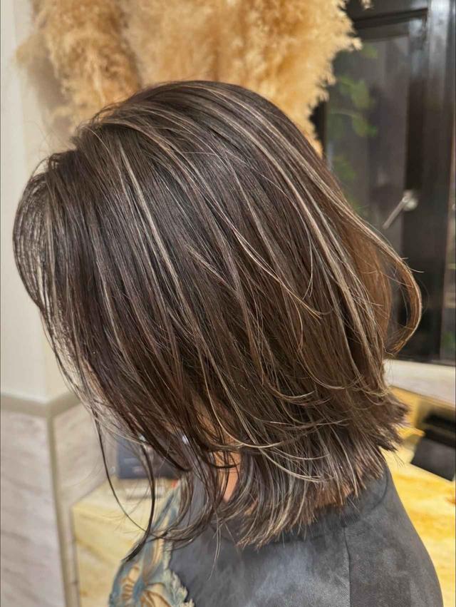 ハイライトをたっぷり入れて、本来の重さを和らげたボブ。まとまりやすさを保ったまま、カラーのイメージで軽さを補えます。実際にトライした@acco.mamaさんは、「頭頂部の気になる白髪も