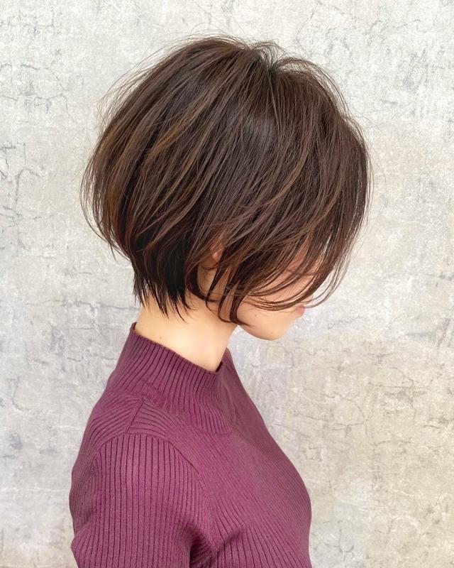 丸みのあるフォルムとくびれラインが特徴の、ナチュラルブラウンのショートボブ。襟足はグッと内へ、サイドも自然に内へ入れることで小顔効果も狙えそう◎ シンプルながらも計算されたシルエットが印象的です。