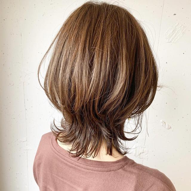 柔らかなベージュカラーが映える、抜け感たっぷりなウルフレイヤーがこちら。トップをふんわり立ち上げ、首元で自然にくびれるようにカットしています。襟足を首に沿うシルエットにすることで、首がほっそり長く見えそう。外ハネにした襟足の毛先の動きが軽やかで、洗練された印象を与えてくれるはず。