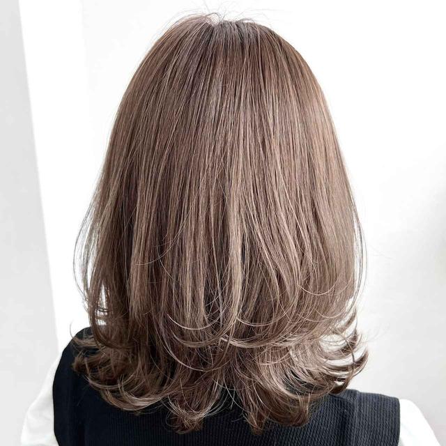 スタイリストの@mabashi_hairさんが、ブリーチなしでできる「秋おすすめカラー」として挙げるのが、こちら。アッシュ系のくすんだトーンが、秋の空気感を連想させます。ハイライトは、ベースより少し明るい程度。目立ちすぎないナチュラルなコントラストで白髪を馴染ませながら、デザインの一部として活かせます。レイヤーを活かしたくびれるシルエットで、トレンド感にも磨きをかけてみて。