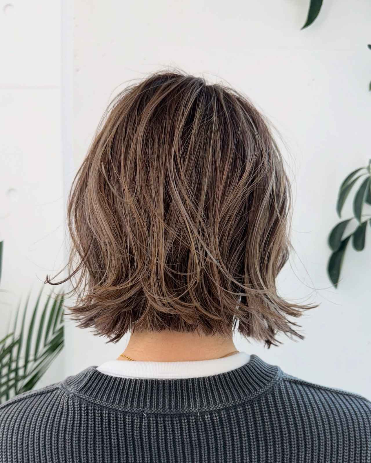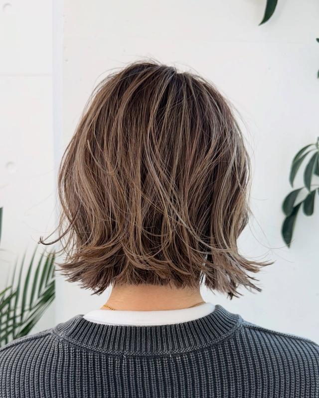 ベージュ系のハイライトをたっぷりと入れたボブスタイル。ベースを暗めにしている分、ハイライトが自然に浮き上がり、外ハネで動かした毛先と相まってラフな質感が引き立っています。くしゃっとした毛束感も、光が差し込むことでさらに立体的に。ボブでものっぺり見えにくく、柔らかく見せたい人にぴったりのスタイルです。