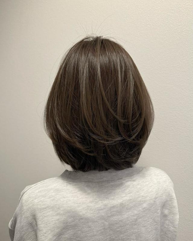 暗めのオリーブブラウンに、たっぷりとレイヤーを入れて毛束を重ねたボブスタイル。ひし形シルエットが自然に生まれ、動きが出るのにまとまりも感じられる、上品な仕上がりです。ふんわりとしたボリューム感が加わることで、重さを残したボブとは違う軽さが楽しめます。落ち着いたトーンでも柔らかく見える、大人に似合うレイヤーボブです。