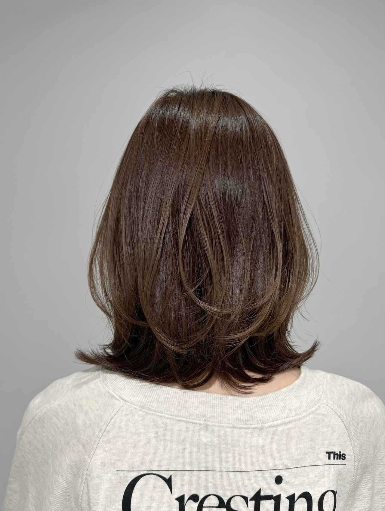 こちらも長めのボブヘアで、エアリーに仕上げたヘアスタイル。トップのレイヤーもゆるく巻き、レイヤーの重なりが柔らかな立体感を演出しています。結べる長さがあるので、ひとつ結びなどのアレンジがききやすいところも嬉しいポイント。透明感のあるブラウン系のカラーリングとも好相性です。