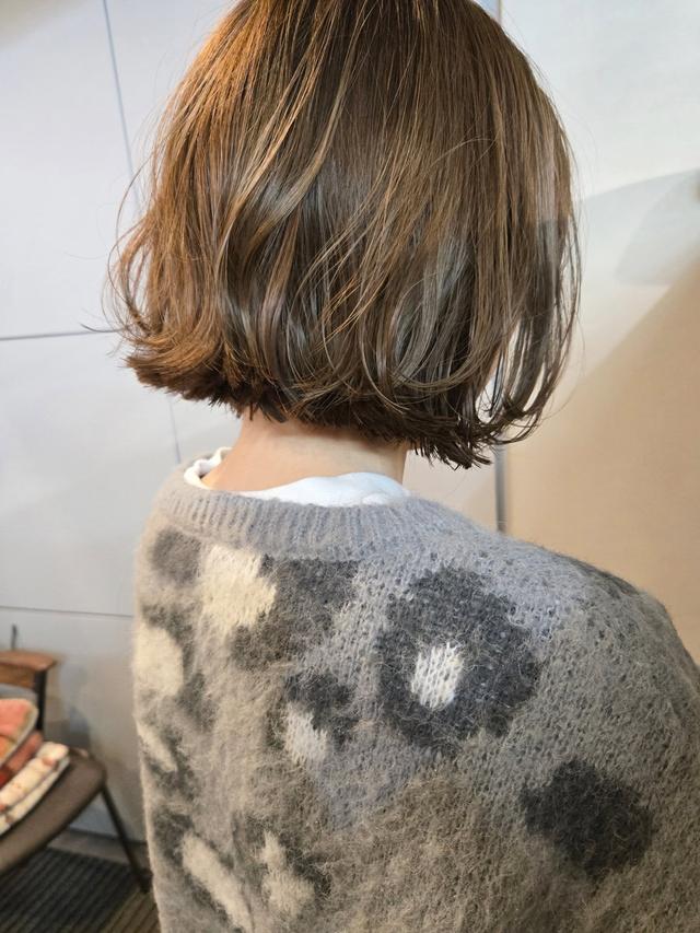 上品なオリーブブラウンのカラーに、レイヤーカットを合わせた丸みボブ。ふんわりとしたシルエットですが、ウエイト位置を低めに設定することで、落ち着いた大人らしさが漂います。カラーの柔らかさにレイヤーの軽さが合わさり、甘さと辛さとが絶妙なバランスに仕上がりました。