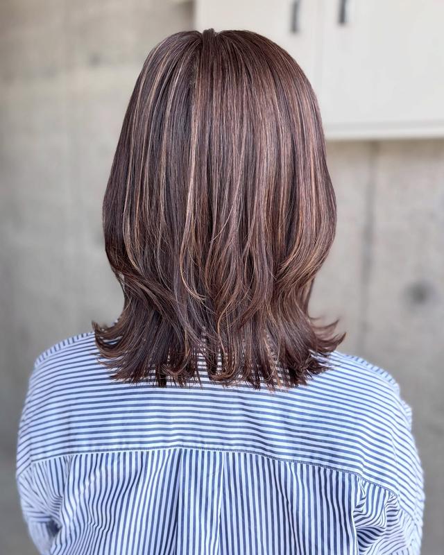 ストレートタッチで毛先を内側へおさめることで、まとまりのあるシルエットに仕上がっています。クシ跡が残るほどの艶感が、大人らしい清潔感を演出。ダークブラウンをベースにベージュ系のハイライトを重ねることで、立体感が加わり、重く見えにくいのもポイントです。