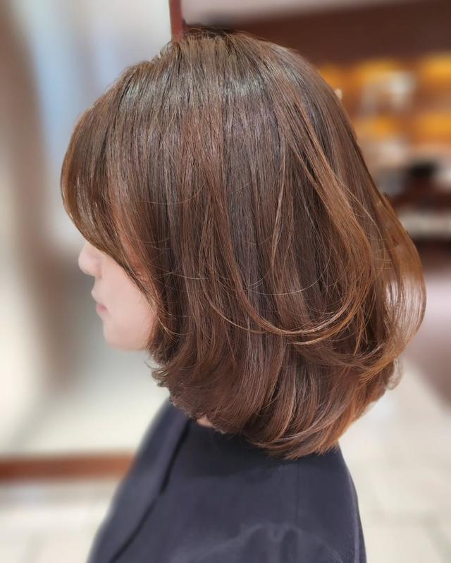 艶やかな明るめブラウンのレイヤーボブ。ベースは厚みを残しながら、自然に内へ入るようカットされており、乾かすだけでも丸みが出やすいのが特徴です。前上がりのラインとトップのワンカールが合わさり、エアリーな動きがプラス。軽さはありつつもスカスカに見えず、大人らしい可愛さが引き立ちます。