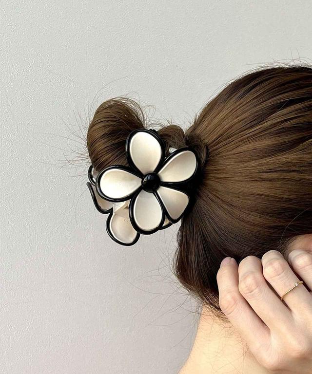 小さなお団子ヘアを覆うようなサイズ感で、インパクトがあるバンスクリップ。コントラストの強いモノトーン配色が、シャープなメリハリを与えてくれます。ひと足先に春夏シーズンのムードを取り入れられそうな、ちょっぴりレトロなフォルムのフラワーモチーフが大人可愛いポイントに。画像のようにお団子ヘアに挟んでも良いけれど、ローポニーのゴムの上から挟んでもグッド。