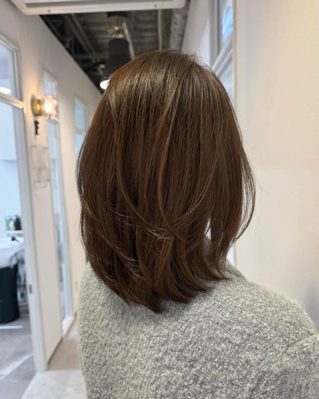 艶やかなブラウンカラーが目を引く、ストレートタッチのミディアムレイヤーです。表面に揺れるような毛束感を作ることで、ふんわりとした柔らかいシルエットを実現しています。ベースはラウンド型にカットしているため、まとまりの良さを維持しつつ、軽やかな動きも楽しめそう。