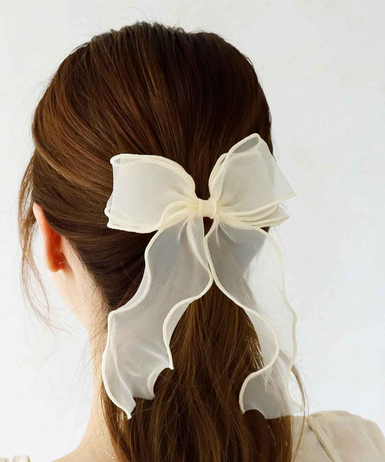 ふんわりとしたチュールを贅沢に使用したダブルリボンが、バックスタイルに優雅な気品を添えてくれます。フックタイプなので高すぎない位置でまとめたポニーテールに差し込むだけでOK。程よい抜け感のある、上品なスタイルに仕上がりそうです。