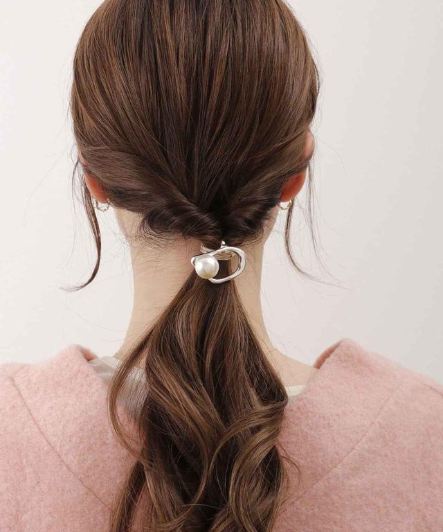 簡単に華やかさを演出できる、2種のビジューがまぶしいデザイン。パール調のパーツが与える高級感は、卒入学式や新年度の式典など、きちんとした雰囲気が必要なシーンで重宝しそう。シンプルなローポニーでも十分決まるけれど、ドレスアップした印象を強めるなら、サイドをねじったり編み込んだりしてみて。