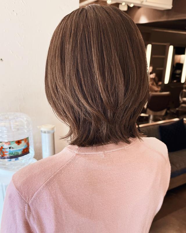 明るいミルキーベージュをベースに、ポイントハイライトを忍ばせた白髪ぼかしのレイヤーミディです。トップもベースもワンカールで仕上げ、毛束感を大切にすることで、上品さと華やかさを両立させています。新しく生えてくる白髪がハイライトとなじむことで、メンテナンスの負担も減らせそうです。