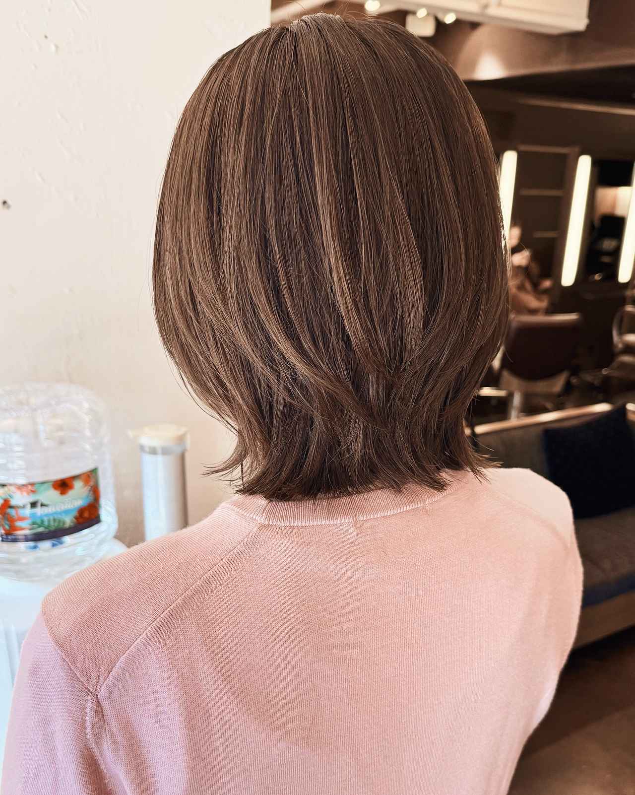 トップを内にいれ、ベースをくびれさせてから外ハネにしたプチウルフボブです。ボブの安定感にウルフの軽やかさが加わることで、抜け感と今っぽさをプラス。ナチュラルな可愛さを大切にしたい人やウルフが初めての人にもおすすめのスタイルです。