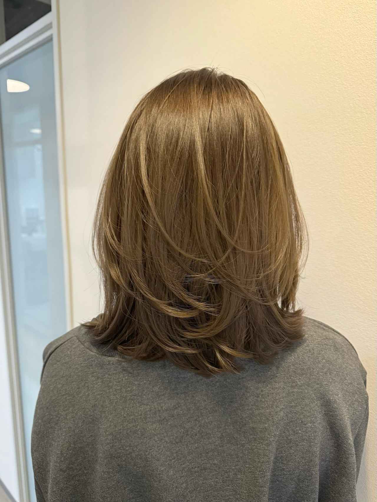 オリーブベージュの柔らかな色味のレイヤーミディ。トップの毛束は揺れるように内側へ流し、ベースは厚みを削ぎ過ぎずに外ハネにすることで、ふんわりとしたボリューム感をプラス。毛束を重ねることで生まれるエアリーな質感が、大人世代にふさわしい上品な華やかさを演出しています。