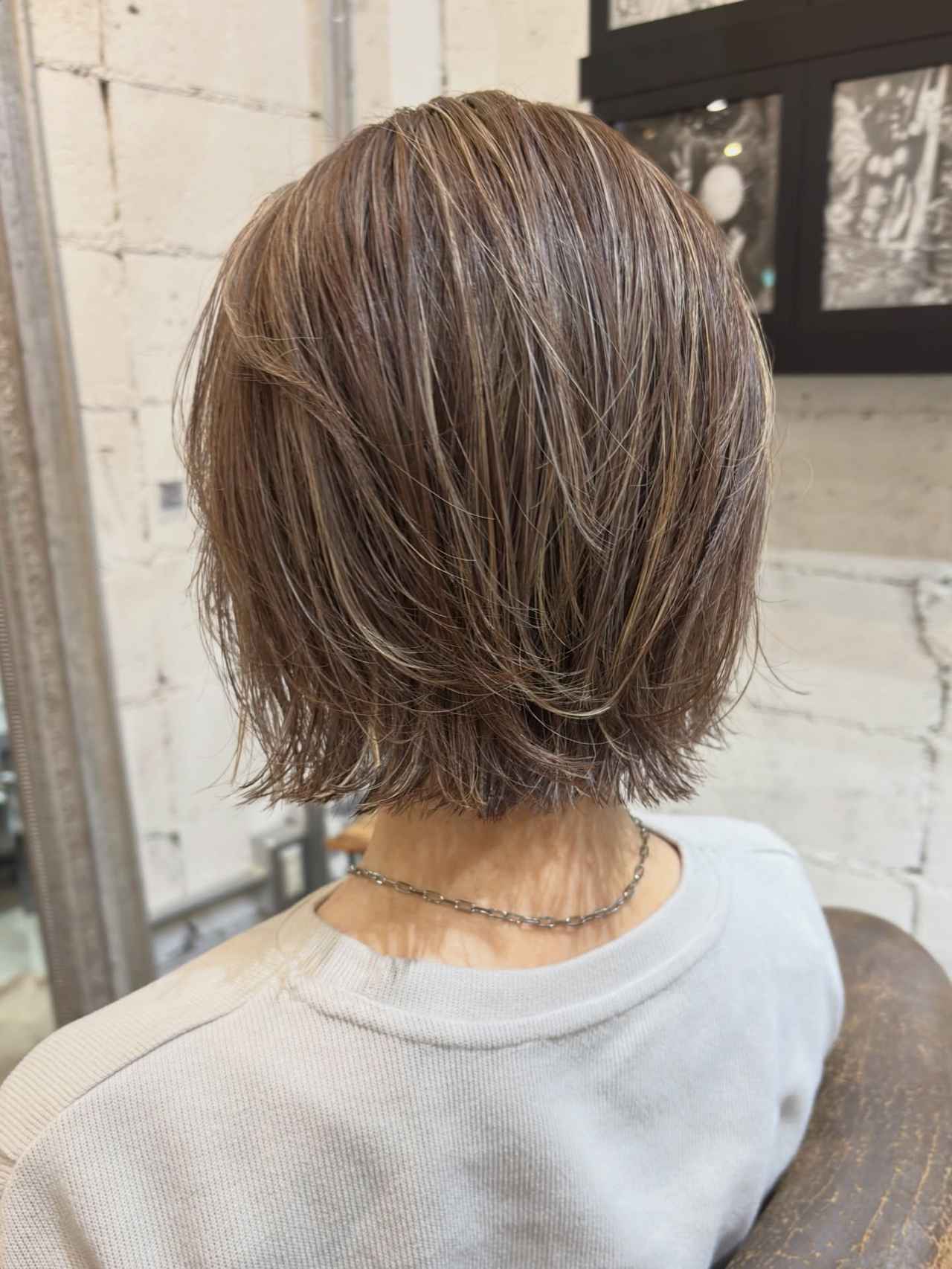 こちらのボブは、細いハイライトによって軽やかさが演出されているのがポイント。白髪を自然に馴染ませながら、こなれた雰囲気に仕上げています。美しい毛流れを強調するハイライトは、大人なボブと好相性。大人の余裕と春らしい軽やかさを両立できそうです。