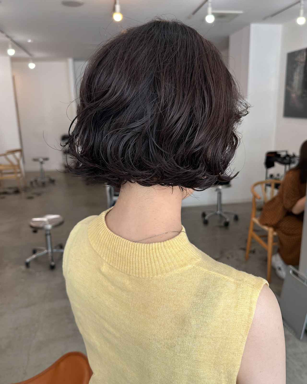 暗髪のミニボブに、ふわふわのパーマを合わせた大人可愛いスタイルです。首元がすっきりと見える短いレングスでありながら、艶やかな毛先を外ハネにすることで華やかな印象を与えてくれます。暗めの髪色でも重たくならず、上品な抜け感を楽しめそう。