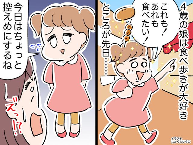 4歳の娘Mちゃんは食べることが大好きで、出かけるたびに「あれも! これも!」とねだっていたそうです。そんなMちゃんがある日、「今日は控えめにする」と言い出し、Tさんを驚かせました。その一言がきっかけで“食育”について考え直す出来事となったのです。