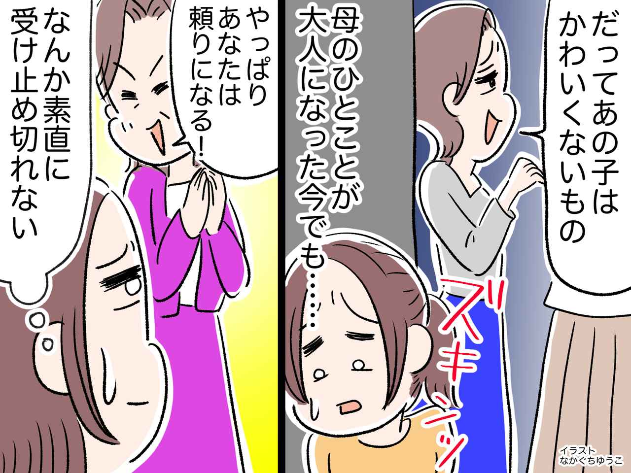 弟が自然にねぎらう姿を見ては、自分との違いに落ち込み、母に認められたい気持ちが募っていきました。