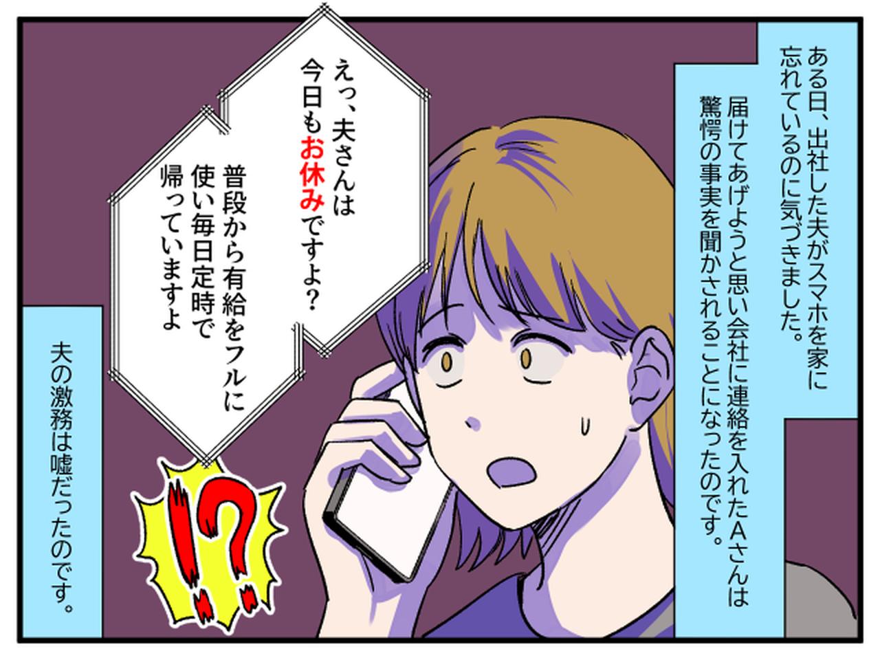 筆者の知人Aさんは結婚3年目の女性。激務の夫を支えるため、家事をすべて引き受けていました。朝早く家を出て夜遅くに帰って来る夫とはすれ違いの生活。自身もフルタイムで働いていたので忙しかったのですが、文句一つ言わず愛する夫を支え続けていたのです。ある日、出社した夫がスマホを家に忘れているのに気づいて会社に連絡を入れると、驚愕の事実が判明し……。
