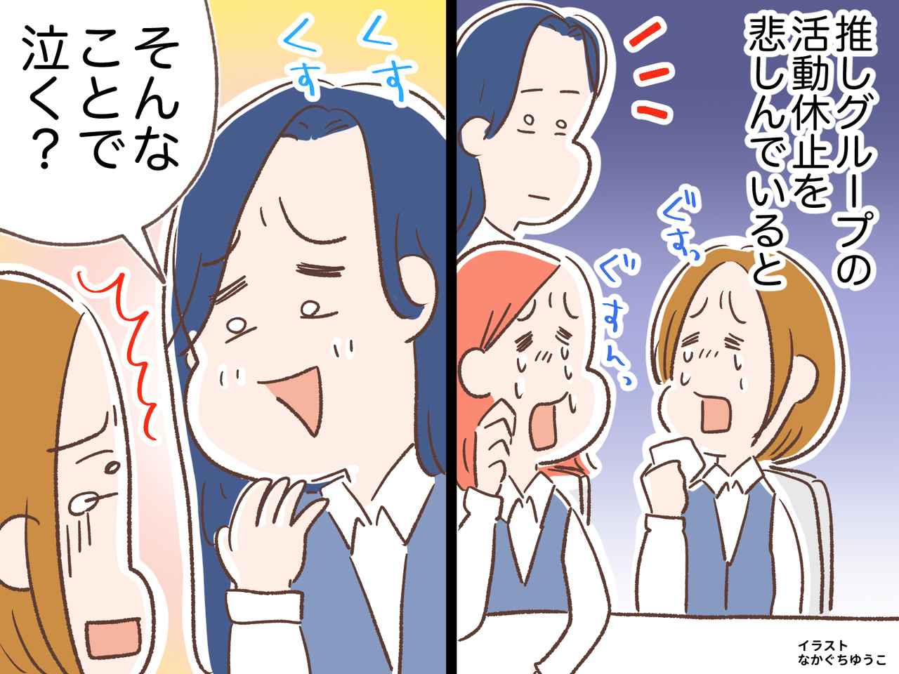 推しグループの活動休止が発表された日、職場のランチ中に推し仲間と話しているうちに涙がこぼれました。けれど、同じテーブルにいた同僚に「そんなことで泣く?」と笑われて胸がチクリ。