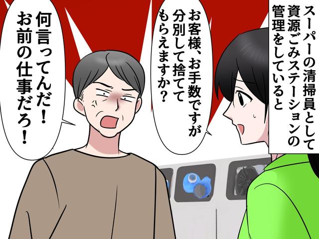 筆者はスーパーの清掃員として働く友人から、ある日の出来事を聞きました。店外の資源ごみステーションで非常識な男性客に遭遇したとき、公衆の面前でヒートアップする男性に、駆けつけた女性店長が放ったスカッとな一言とは?