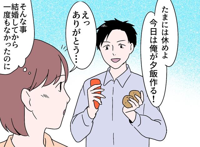 共働きで、家事や仕事に慌ただしい毎日。ある日仕事から帰ると、「たまには休めよ」と、夫が夕飯を作ってくれたのですが……。