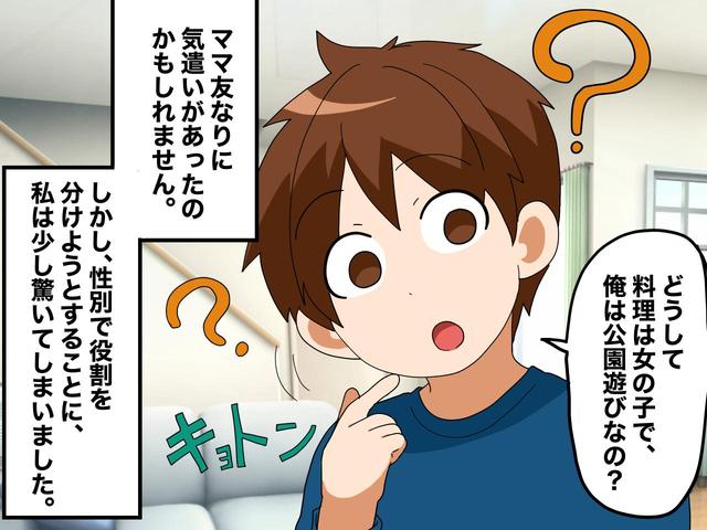 役割分担を考えていると、ママ友からは「女の子は料理しようね、男の子は公園で遊んでていいよ」という性別で役割を分ける発言。その時A子さんは──。